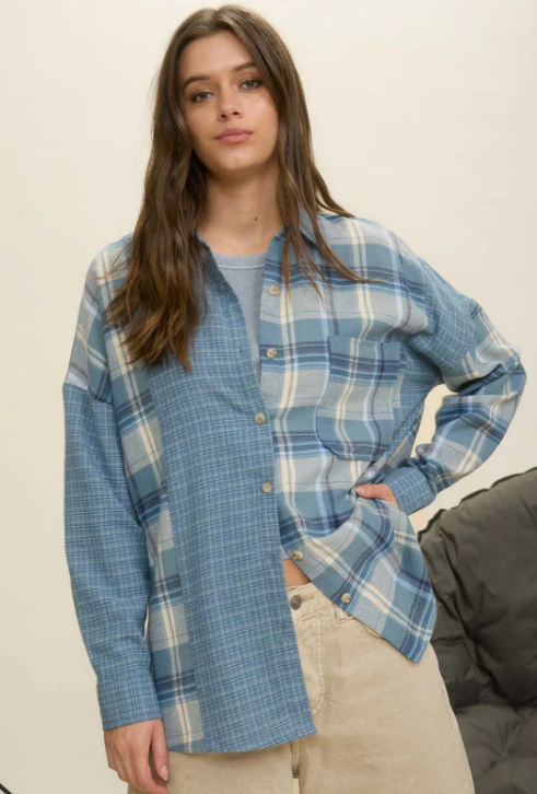 Blue Mixed Plaid Long Sleeve Button Front Top