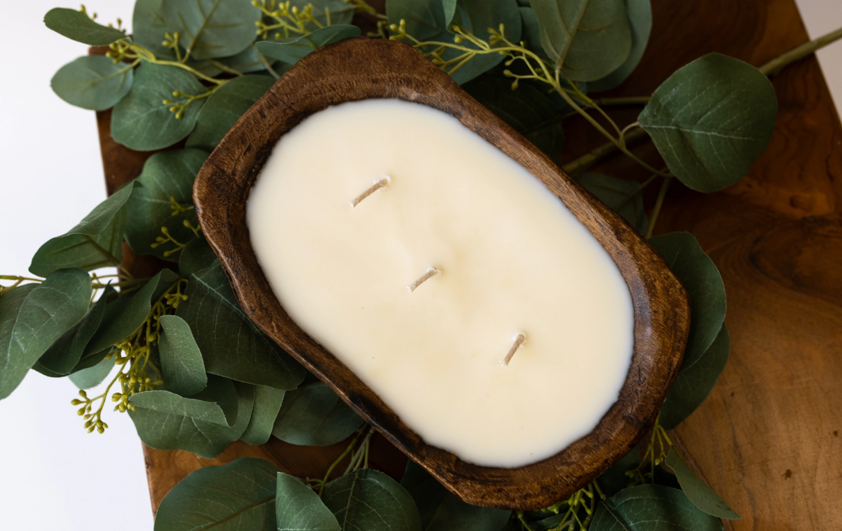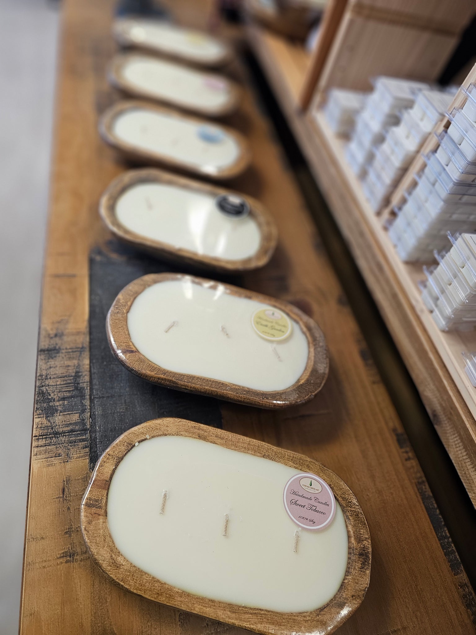 100% soy and scented with essential oils. Hand-poured into an 9" hand- carved wood bowl. Bowls will vary in size and could have knife marks, knots and blemishes. This only adds to the rustic charm. No two bowls are alike.