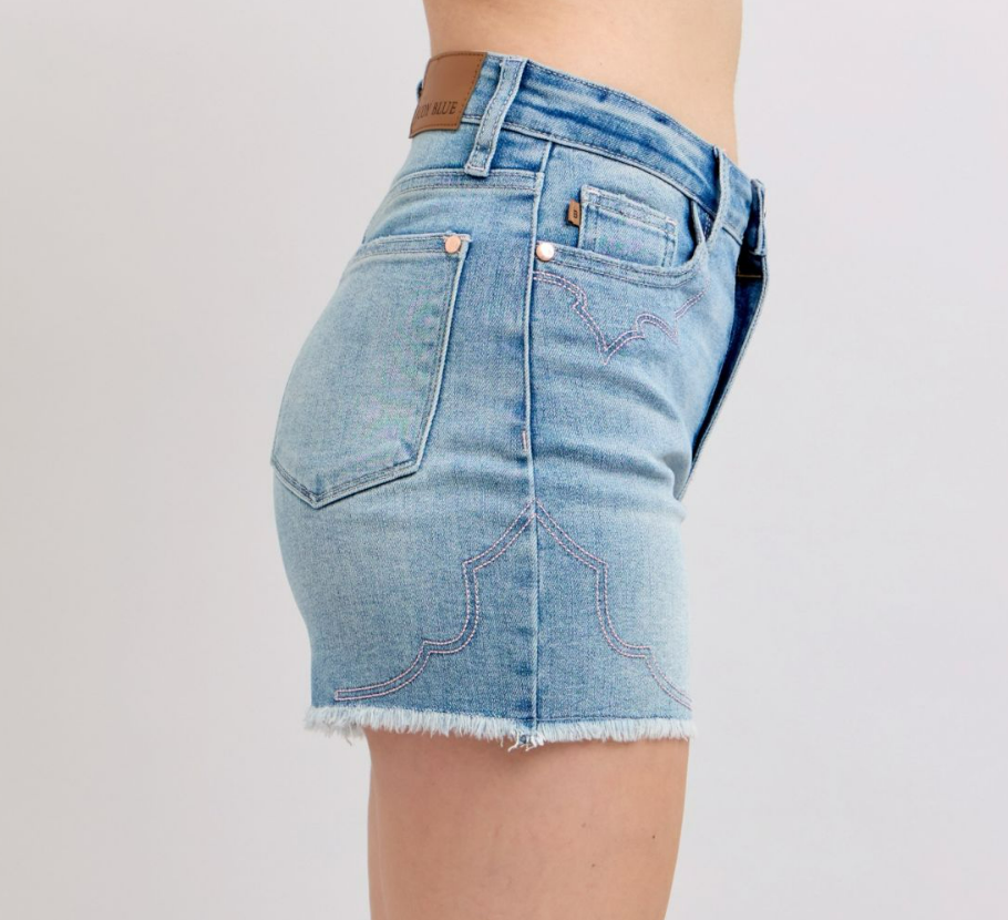 Judy Blue High Waist Shorts with Light Pink Western Embroidery