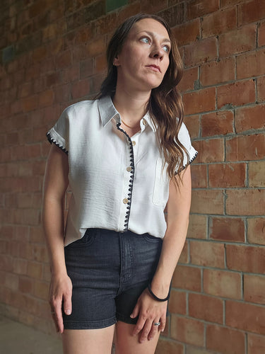 Ivory + Black Contrast Stitch Short Sleeved Button Front Top - Plus + Reg